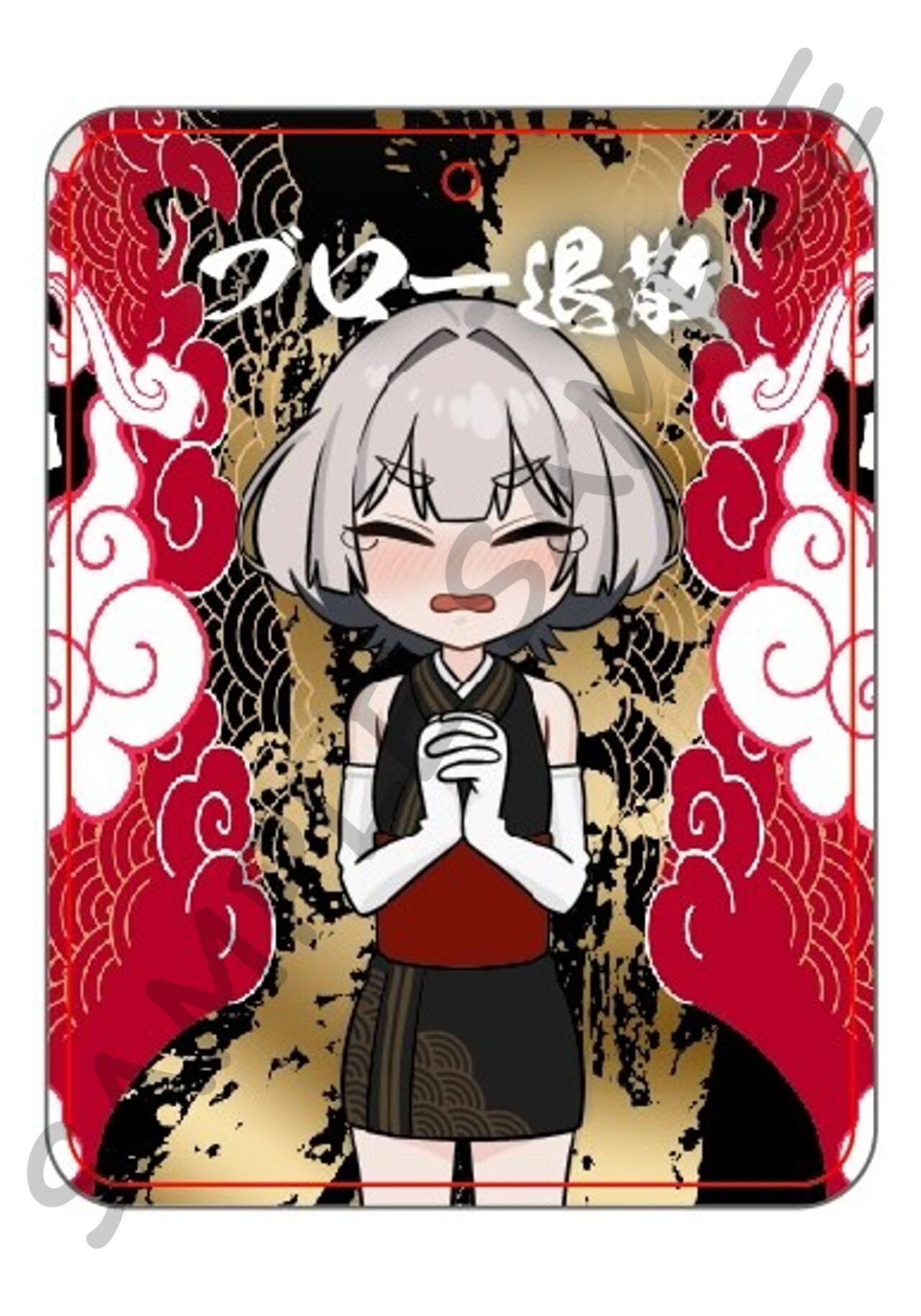 モータースポーツにおけるマシントラブルの発生率を下げるため祈りを捧げる咲羅を描いた、斬新なお守り型エアフレッシュナーです。